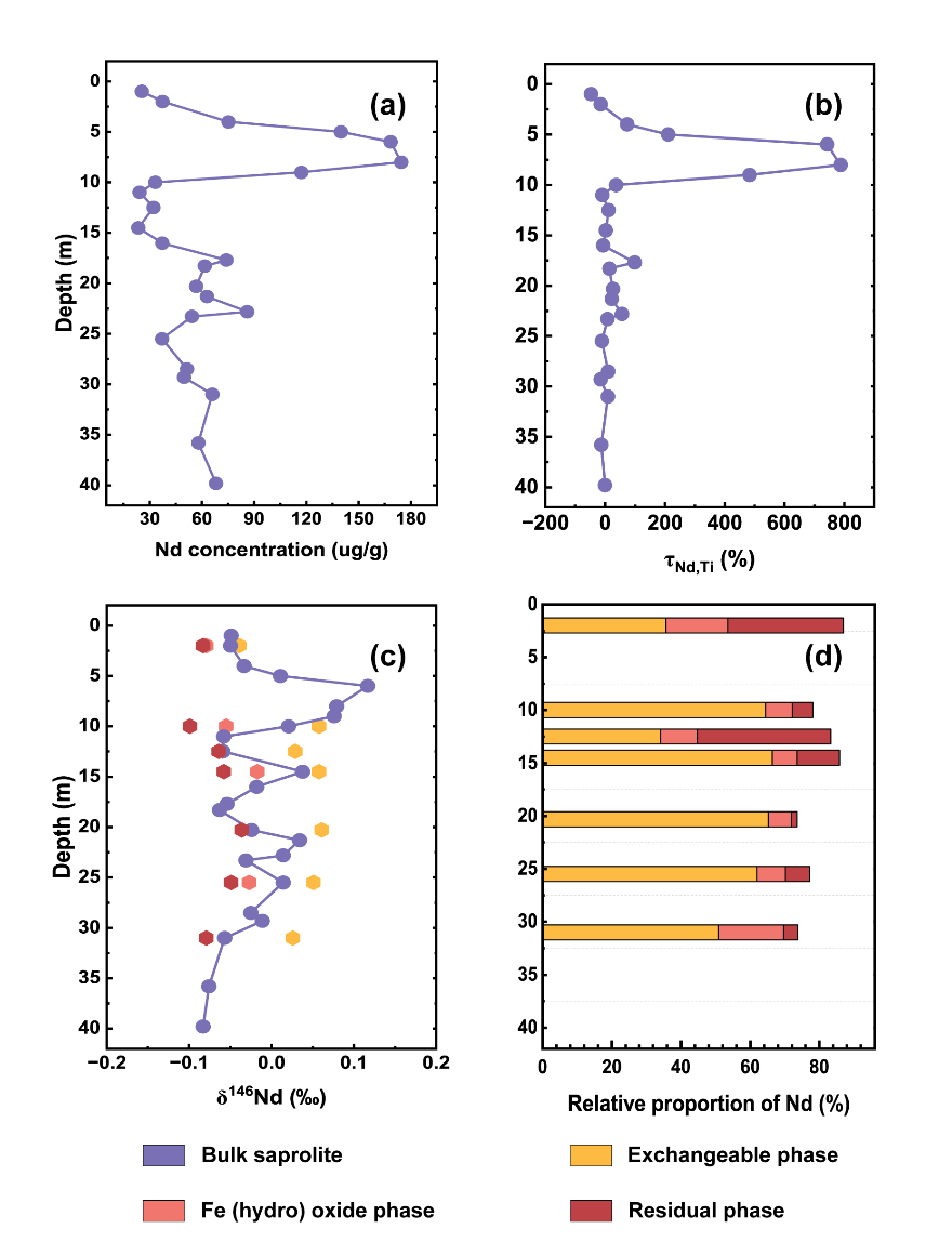 图1. 花岗岩风化剖面全岩样品中(a)Nd浓度和(b)Nd迁移率(τNd,Ti)的变化;(c)全岩样品和不同化学提取相态的δ146Nd值;(d)不同化学提取相态中Nd的比例。